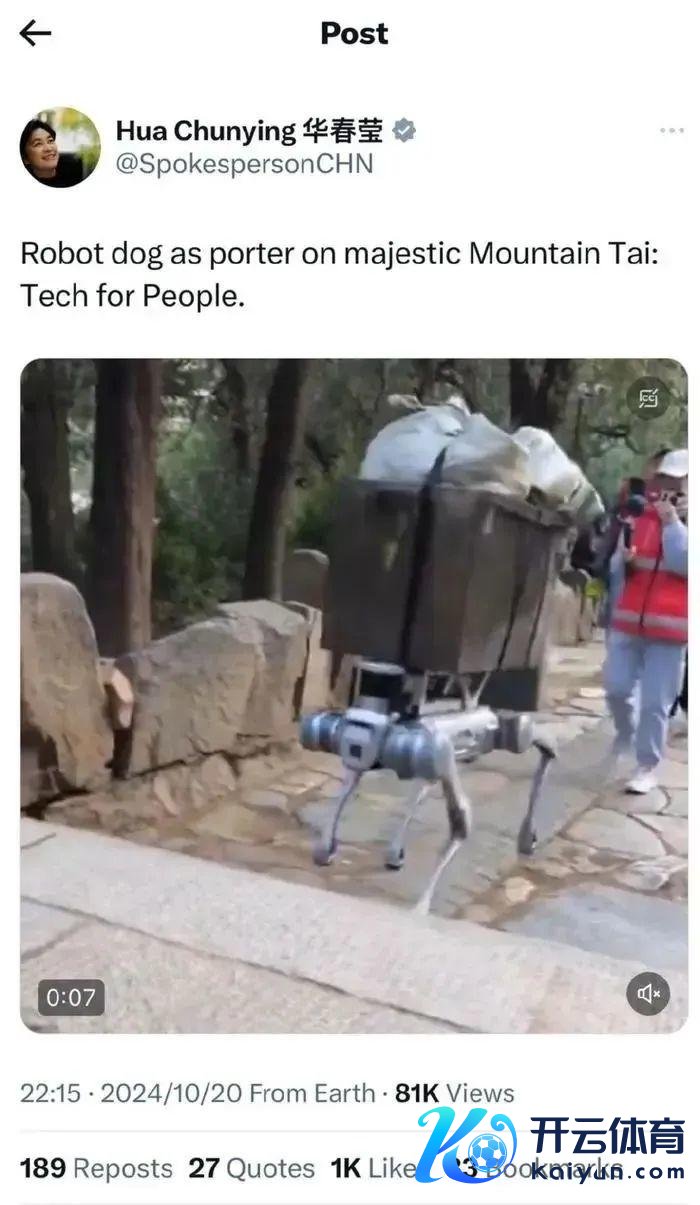 中海社交部副部长华春莹在社交平台上发布了“机器狗”在泰山的关连影片,并配文:“机器狗”在纷乱的泰山上充任搬运工:科技造福东说念主类。
