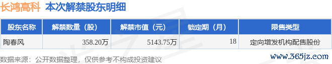证券之星讯息云开体育,凭据阛阓公开信息整理,长鸿高科(605008)于8月27日将有358.2万股限售股份解禁,为公司定向增发机构配售股份,占公司总股本0.55%。(本次数据凭据历史公告整理得出,内容情况以上市公司最新公告为准)本次解禁后,公司已无穷售股份。具体如下图所示: