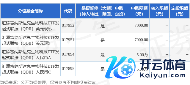 注:1、自2025年09月02日起(含2025年09月02日),汇添富纳斯达克生物科技ETF发起式相连(QDII)东说念主民币A暂停大额申购、大额依期定额投资业务,单日单个基金账户单笔或多笔累计申购、依期定额投资的金额不应跳跃50000东说念主民币元(含50000东说念主民币元)。当单日某基金账户单笔或多笔累计申购、依期定额投资该份额的金额跳跃50000东说念主民币元,本公司将部分或一皆拆开。该份额暂停上述大额业务本领,其他业务仍照常办理。本基金汇添富纳斯达克生物科技ETF发起式相连(QDII)东说念主民币A还原大额申购、大额依期定额投资业务的具体时刻将另行公告。2、自2025年09月02日起(含2025年09月02日),汇添富纳斯达克生物科技ETF发起式相连(QDII)东说念主民币C暂停大额申购、大额依期定额投资业务,单日单个基金账户单笔或多笔累计申购、依期定额投资的金额不应跳跃50000东说念主民币元(含50000东说念主民币元)。当单日某基金账户单笔或多笔累计申购、依期定额投资该份额的金额跳跃50000东说念主民币元,本公司将部分或一皆拆开。该份额暂停上述大额业务本领,其他业务仍照常办理。本基金汇添富纳斯达克生物科技ETF发起式相连(QDII)东说念主民币C还原大额申购、大额依期定额投资业务的具体时刻将另行公告。3、自2025年09月02日起(含2025年09月02日),汇添富纳斯达克生物科技ETF发起式相连(QDII)好意思元现钞暂停大额申购、大额依期定额投资业务,单日单个基金账户单笔或多笔累计申购、依期定额投资的金额不应跳跃7000好意思元(含7000好意思元)。当单日某基金账户单笔或多笔累计申购、依期定额投资该份额的金额跳跃7000好意思元,本公司将部分或一皆拆开。该份额暂停上述大额业务本领,其他业务仍照常办理。本基金汇添富纳斯达克生物科技ETF发起式相连(QDII)好意思元现钞还原大额申购、大额依期定额投资业务的具体时刻将另行公告。4、自2025年09月02日起(含2025年09月02日),汇添富纳斯达克生物科技ETF发起式相连(QDII)好意思元现汇暂停大额申购、大额依期定额投资业务,单日单个基金账户单笔或多笔累计申购、依期定额投资的金额不应跳跃7000好意思元(含7000好意思元)。当单日某基金账户单笔或多笔累计申购、依期定额投资该份额的金额跳跃7000好意思元,本公司将部分或一皆拆开。该份额暂停上述大额业务本领,其他业务仍照常办理。本基金汇添富纳斯达克生物科技ETF发起式相连(QDII)好意思元现汇还原大额申购、大额依期定额投资业务的具体时刻将另行公告。